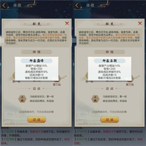 简单的说这个关系的是征程里夜猎(相当于地下的神游)次数和收获多少,神格越高收获越多(例如:神宗巅峰和神宗后期的收益效果如下图,是有差别的)。正常不用避劫丹的话,是3天才可以打一轮(一轮必须2胜才可以进阶神格,否则神格降级)。每一阶神格,又分为入门、初期、中期、后期、巅峰5个小阶段,若是3天才可以挑战一个阶段,一个大阶段需要15天才能晋升一次神格。