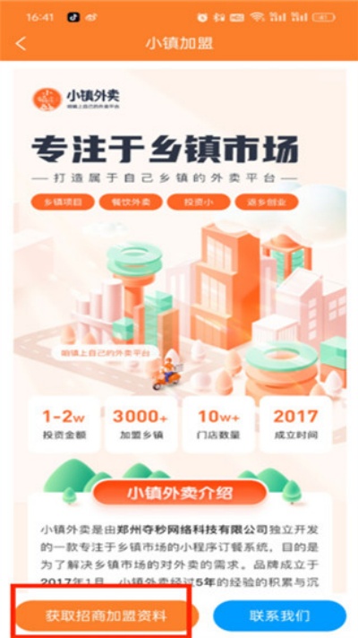 2、在“小镇加盟”页面中可查看详细招商介绍内容,点击【获取招商加盟资料】获取相关信息。
