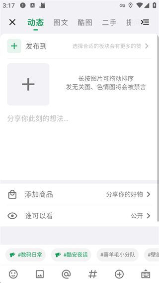 点击【+号】可发布动态,添加图片、分享想法、设置可见范围等