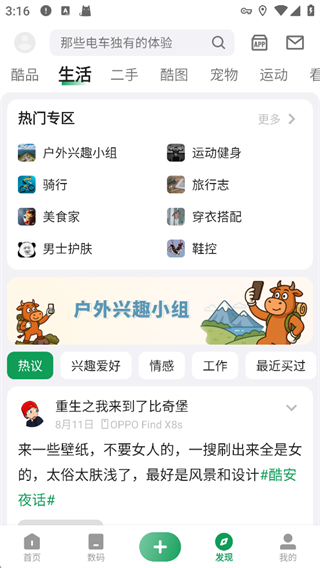 涵盖生活、二手、运动等类热门专区点击可跳转参与热门话题
