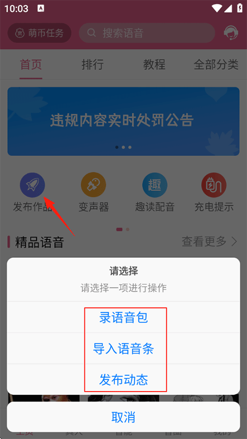 3、或者在首页点击发布作品,在弹出的列表中选择导入语音条。