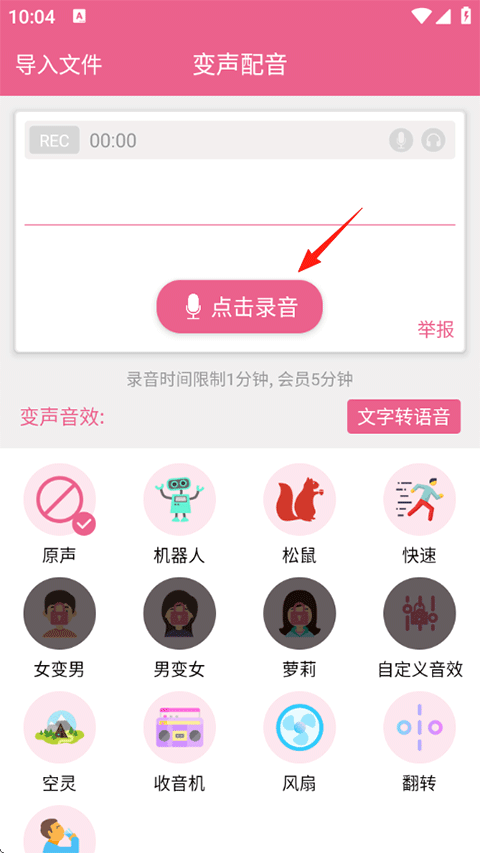 2、点击录音或者右上角导入文件,然后在下方选择变声音效,完成后确认无误即可发布作品到平台;