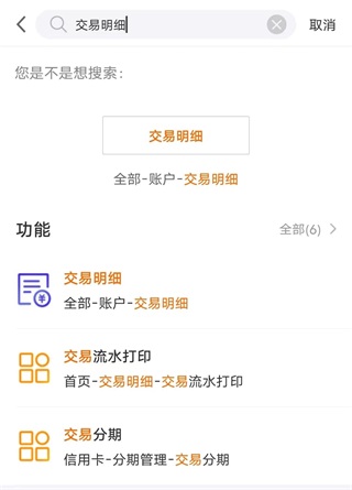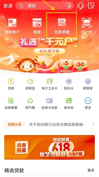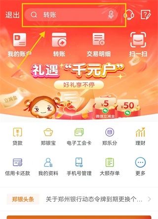 4.在郑州银行手机银行首页上方搜索栏,搜索“交易明细”,点击即可进入查询。