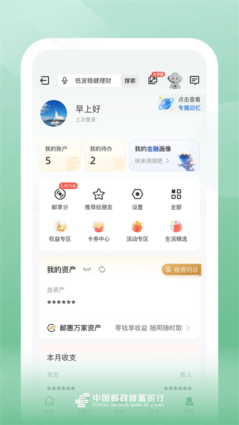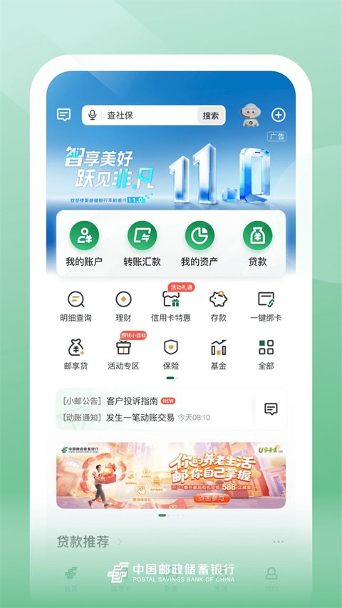 邮储银行App官方版是中国邮政储蓄银行全新打造的新一代手机银行,系统按照“以客户为中心”的理念设计和构建,让您在使用手机银行系统时感到简单、方便、安全、快捷、时尚。中国邮政储蓄银行手机银行致力于建成一个符合中国邮政储蓄银行应对全方位、立体化金融服务的需要,涵盖基于移动互联网渠道的个人金融服务品种,为客户提供多功能、现代化、简易、便捷、安全的移动金融服务窗口,实现符合中国邮政储蓄银行渠道发展需要,满足客户对于移动金融产品灵活创新要求的电子交易平台。