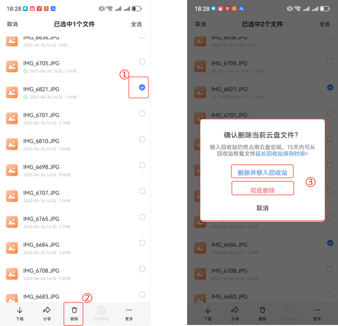 ● 选择 删除并移入回收站 的文件,会放入云盘回收站内保存,回收站文件会占用您的云盘空间