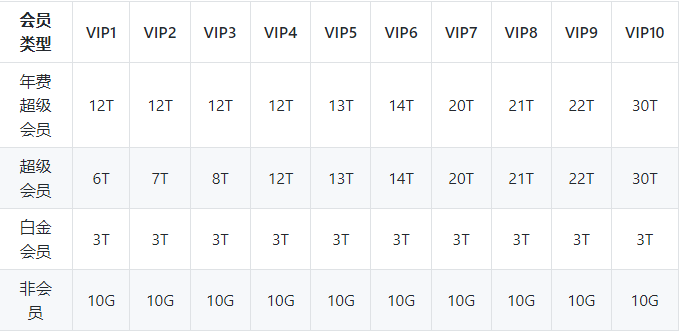 若当月云盘高速流量使用完后,用户可升级更高级会员享受更多高速流量。年费超级会员最高享受10TB高速流量,使用完需等待流量周期结算后方可再享受高速流量