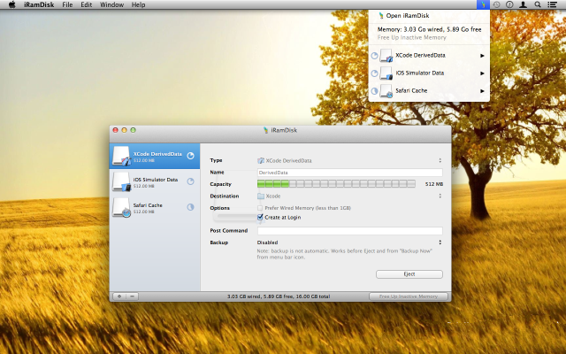 2、RamDisk使用您的RAM,以创建一个新卷显示为普通的驱动器,可以独立安装和使用在你的搜索的一部分。由于访问时间这些DATAS是方式更比平时快(它可以达到正常速度的10倍以上,一些配置),它可以让你做一些事情,你将无法实现采用了经典的硬盘驱动器 (连同减轻你的内部),如获得了写作速度惊人的快或移动Xcode中,Safari浏览器,某些应用(…)在它的临时文件,当你想优化自己的访问时间 以及这些文件的影响降至最低你的SSD。