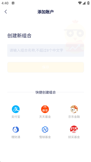 快捷创建组合:选择下方的平台图标(如支付宝、天天基金等),通过授权快速导入该平台的账户信息。
