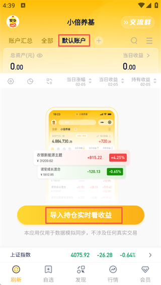 1、打开小倍养基App,点击默认账号→导入持仓实时看收益。