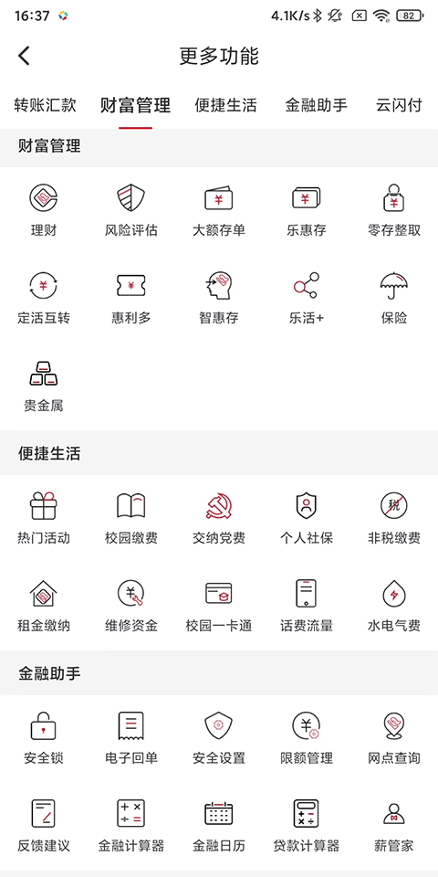 包括银行公告、理财计算器、网点查询、投票等