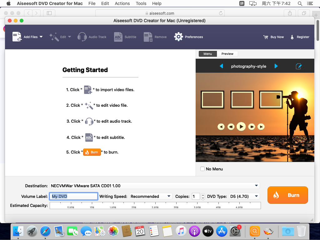 Aiseesoft的DVD造物主可以将视频刻录到几乎所有的DVD + -R/RW,DVD-RAM,DVD-5(4.5G)和DVD-9(8.5GB)光盘。创建的DVD格式的光盘可以发挥最便携和家用DVD播放机上的完美。
