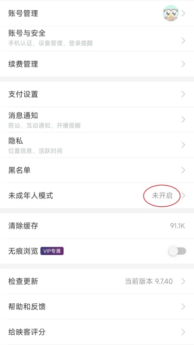 3、在页面中部找到“未成年模式”,点击右侧状态选项。