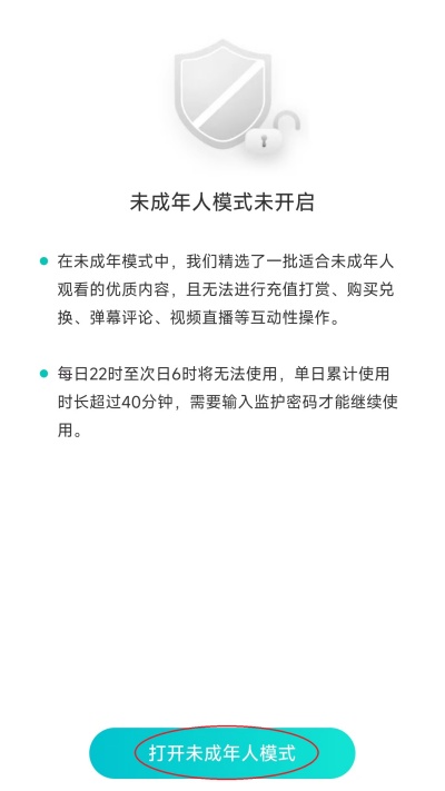 4、点击屏幕下方的“打开未成年模式”进入开启流程。