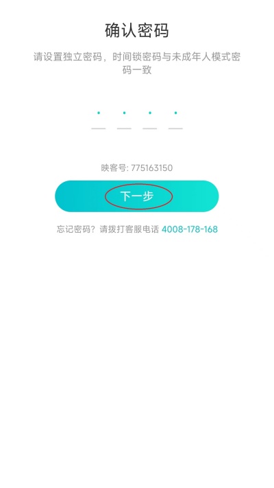 6、再次输入确认密码并点击“下一步”,完成未成年模式开启。