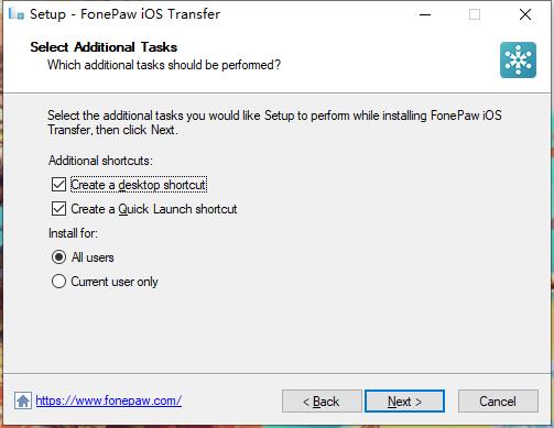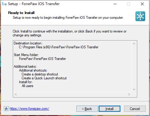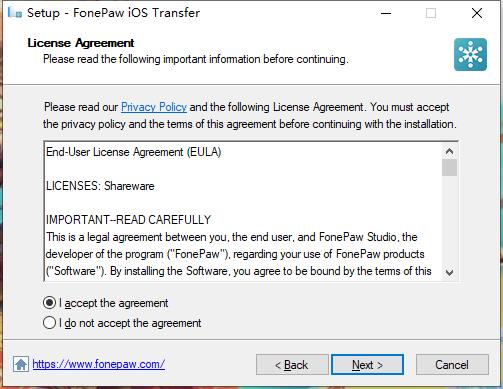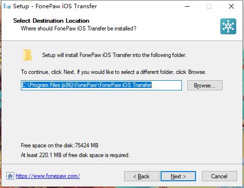 安装向导默认设置的软件默认安装路径为C:\Program Files (x86)\FonePaw\FonePaw iOS Transfer