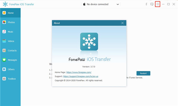9、双击打开FonePaw iOS Transfer软件,点击红色选框下的About,如下图软件安装完成,可以放心使用软件