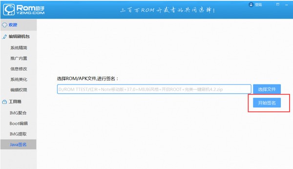 选择刷机包或apk文件后,点击开始签名
