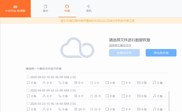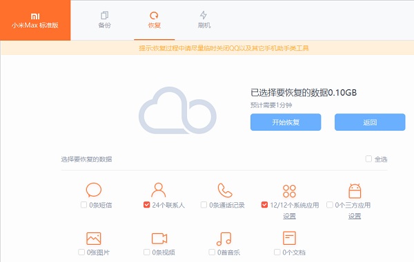 1、点击“恢复”进入恢复引导页面,选择之前备份的数据项,点击“恢复到手机”进行恢复: