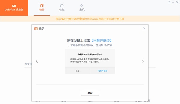 2、点击“新建备份”会提示等待手机授权,需要在手机上进行授权操作:
