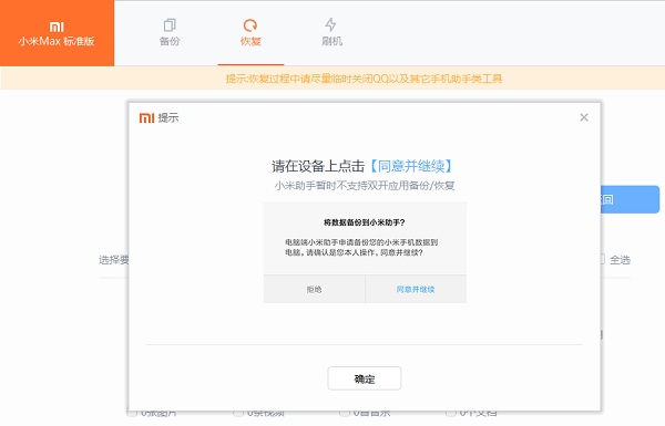 3、点击“开始恢复”,需要手机进行恢复授权: