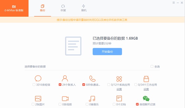 4、PC端助手收到手机发送的基本信息,选择要备份的内容: