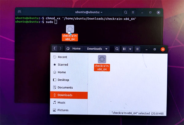 输入「chmod +x 」注意加号前面有个空白键、x 后面也有空白键, 然后将Checkra1n 拖入终端机视窗中按下Enter。接着输入「sudo 」注意sudo 后面有个空白键,然后再把Checkra1n 拖入终端机视窗中按下Enter。如果你没有办法将Checkra1n 拖入终端机中,可以将它复制到桌面上,然后对它按右键并选择Show in File,再拖进去终端机一次即可。