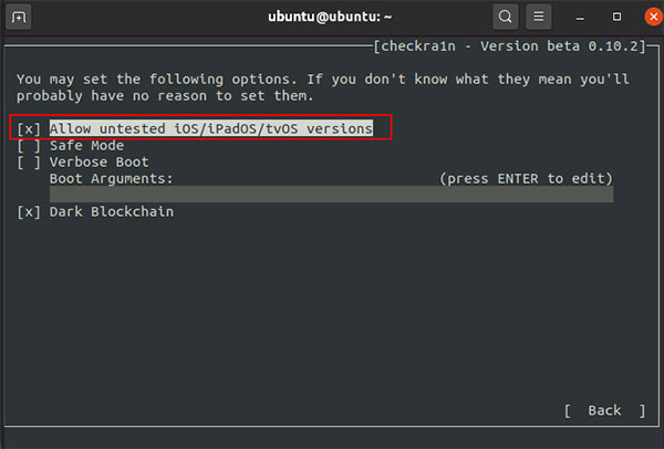 然后选择Allow untested iOS/iPadOS/tvOS versions 然后点击下方Back 回到上一页,最后按下Start 开始越狱即可;