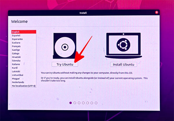 选择「Try Ubuntu」从USB 启用系统;