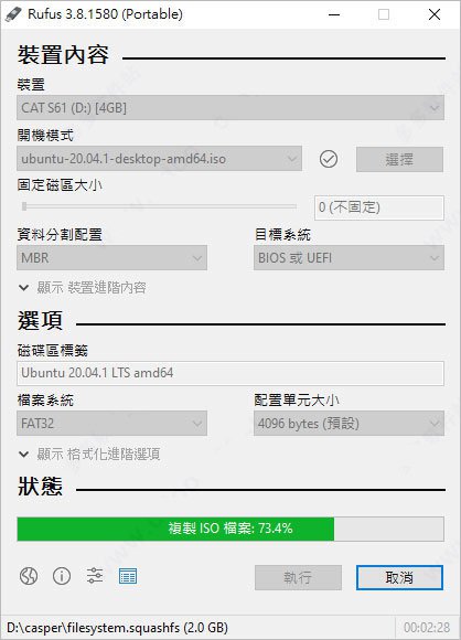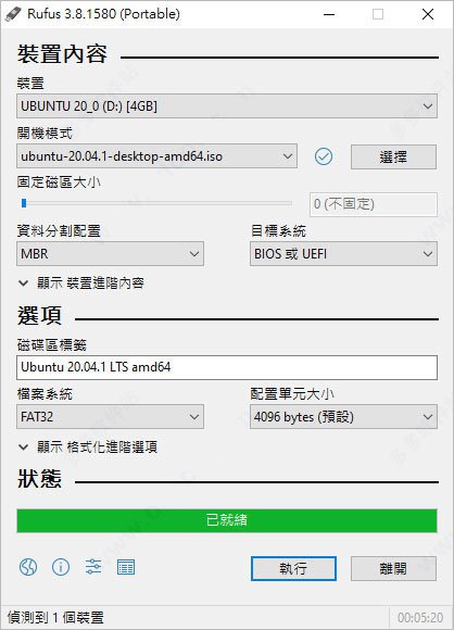插入USB 并开启Rufus 找到「选择」,找到刚刚下载的「ubuntu-20.04-desktop-amd64.iso」,其余的选项都保持预设即可,点击「执行」开始制作;