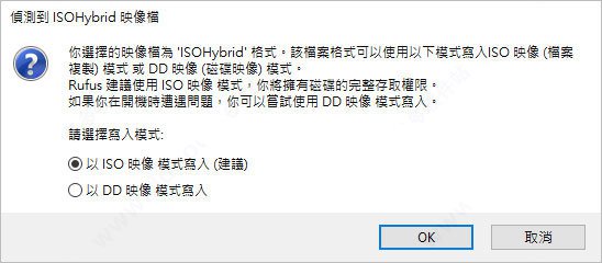 然后会看到一个警告,内容大概就是说明USB 中的所有资料将会被格式化,若有重要资料的话请先进行备份,接着选择「以ISO 映像模式写入(建议)」后按下OK;