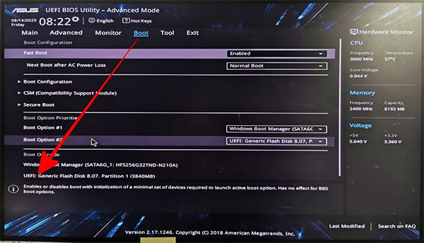 进入BIOS 控制视窗后,选择刚刚建立好的开机USB 来启用系统;
