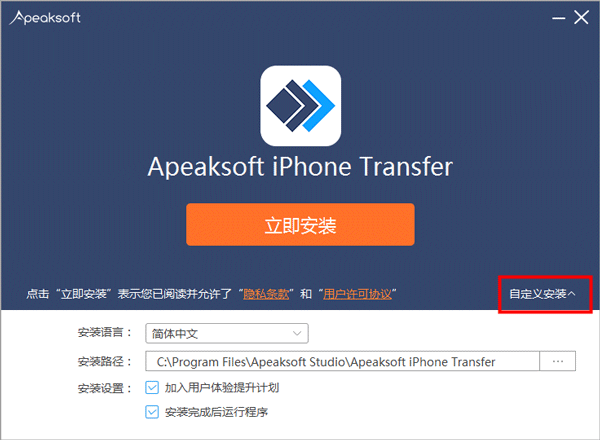 安装向导默认设置的软件默认安装路径为C:\Program Files (x86)\Apeaksoft Studio\iPhone Transfer
