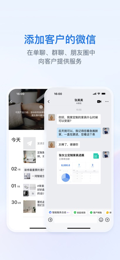 【消息互通】可添加客户的微信,通过单聊或群聊为客户提供服务。群人数可达500人。