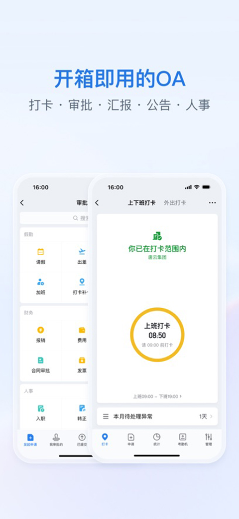 【工作台】在手机上就能轻松完成考勤、请假、报销和读公告。