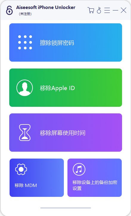 随着社会的发展,智能设备的增加使得大家的生活越来越便利,但同时也增加了如手机锁屏密码、消费密码以及特别像苹果手机至关重要的Apple ID登入密码等一系类安全操作,你是否也会经常因忘记密码或是操作过于频繁被锁定而感到困扰呢?Aiseesoft iPhone Unlocker是一款专为时下苹果智能手机所研发推出的专业性IOS解锁工具应用,界面简洁清爽,集清除密码、删除Apple ID、检测时间等三种模式功能于一体,不仅可以轻松快捷的帮助你解除以及找回Apple ID密码,让你正常使用运行手机设备。而且还提供详细的引导步骤,用户只需根据自身需求选择,一键连接到设备即可自动执行任务将原始设置的密码以及手机保存的数据全部清除,以便你更好的使用和完成重置密码服务。