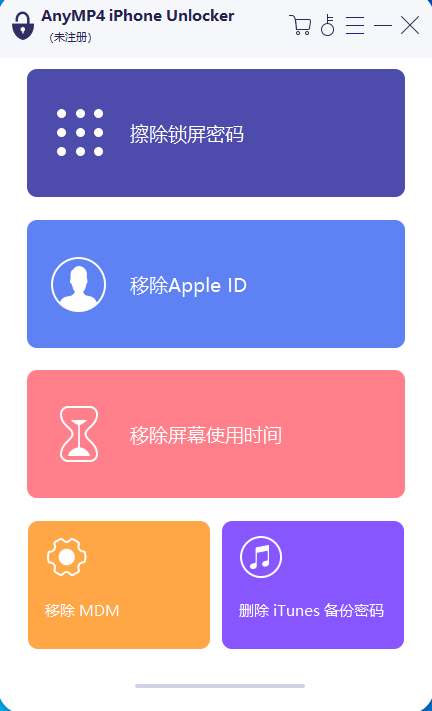 AnyMP4 iPhone Unlocker是一款专业的IOS设备解锁工具,有着3种破解模式供用户解锁iOS屏幕密码、删除Apple ID以及绕过Screen Time密码,如此一来就算是你忘记了密码或者是回收了一个二手设备却无法解开的时候就可以使用本软件进行破解;AnyMP4 iPhone Unlocker可以帮助用户解锁自己的ios手机,当用户忘记手机的密码的时候,就能够通过软件进行解锁哦,整体的应用以及功能都非常出色,可以快速的完成工作,解锁用户的手机,恢复使用;AnyMP4 iPhone Unlocker还可以帮助用户快速将iPhone上的照片、图片、音乐、视频、联系人、短信、语音信箱等快速传输到电脑和iTunes上,当然,也可以将它们从电脑上导入到你的移动设备上,甚至可以在iOS设备之间传输文件,非常实用,有兴趣的小伙伴快来下载体验吧!