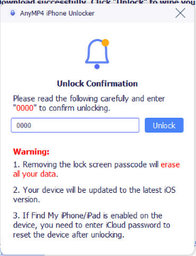 点按“解锁”按钮来抹掉您的密码,然后输入“0000”来确认解锁。