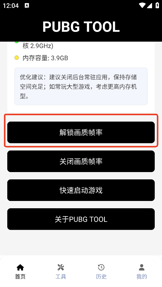1、下载完成之后打开PUBGTool电脑版,点击第一个解锁画质帧率。