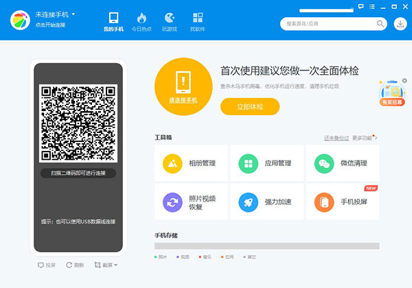 2、点击立即扫描,就会打开360手机助手电脑版。如果你的手机是第一次在此电脑上使用360手机助手,它会检查你的手机与电脑的连接状态
