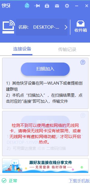 使用快牙时如遇到“无法启动热点”的问题,我们可以先检查无线网卡是否正常开启,由于“快牙电脑版”支持虚拟WiFi创建,所以可多次尝试重启“快牙电脑版”创建连接状态。还有注意查看是否安装了其它热点软件,可删除之后再试。